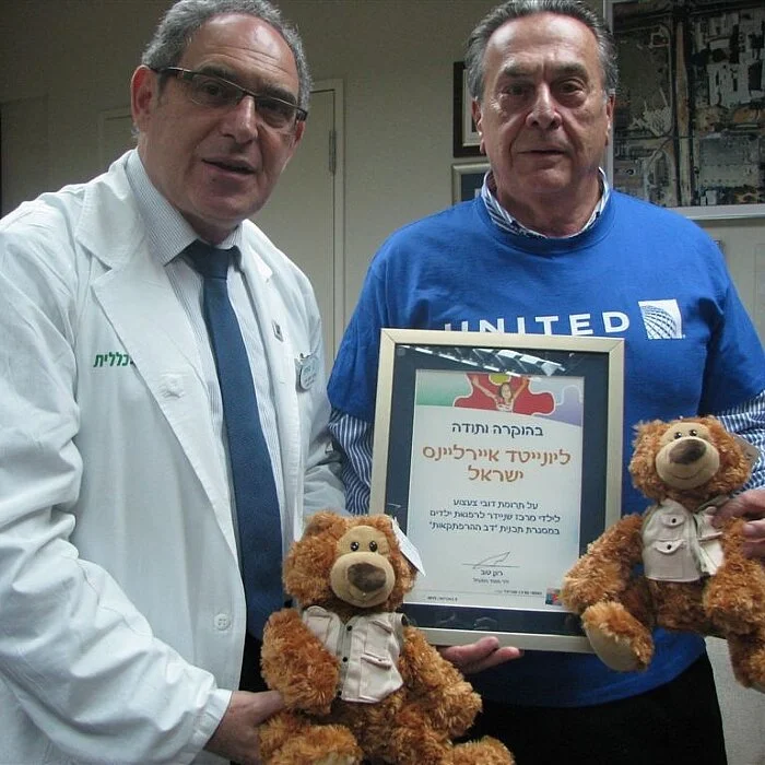 נציגי חברת התעופה "יונייטד איירליינס ישראל" ביקרו השבוע ילדים מטופלים במרכז שניידר וחילקו להם דובוני צעצוע. הביקור התקיים בשיתוף עמותת נאמני מרכז שניידר. פרופ' יוסף פרס, מנהל מרכז שניידר, העניק לאבי פרידמן, מנכ"ל "יונייטד איירליינס ישראל", תעודת הוקרה ובירך אותו על היוזמה המבורכת.